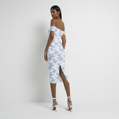 White Floral Bardot Bodycon Midi Dress River Island