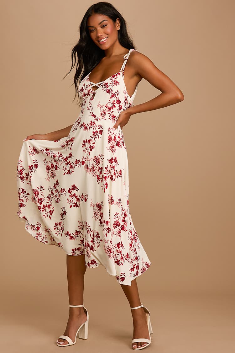 White Floral Print Dress Floral Midi Dress Side Tie Midi Lulus
